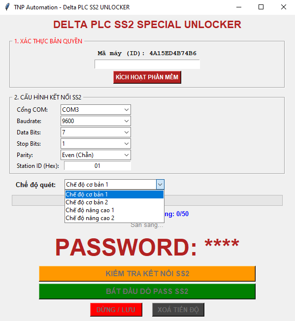 Giải pháp tối ưu – Tiết kiệm chi phí – Hỗ trợ kỹ thuật chuyên sâu Bạn cần xử lý password cho dòng PLC Delta SS2 nhưng muốn một giải pháp kinh tế? Phiên bản SS2-Limited từ TNP Automation là lựa chọn hoàn hảo dành cho bạn. Đặc điểm nổi bật: Hỗ trợ đa năng: Tích hợp linh hoạt 4 chế độ dò tìm từ cơ bản đến chuyên sâu (Cơ bản 1 & 2, Nâng cao 1 & 2), giúp xử lý mọi cấp độ bảo mật của dòng SS2. Quản lý thông minh: Phiên bản giới hạn 50 lần dò thành công, phù hợp cho các đơn vị bảo trì hoặc anh em kỹ thuật làm dự án lẻ. Kích hoạt nhanh chóng: Hệ thống khóa bản quyền theo máy, đảm bảo tính bảo mật và độc quyền.